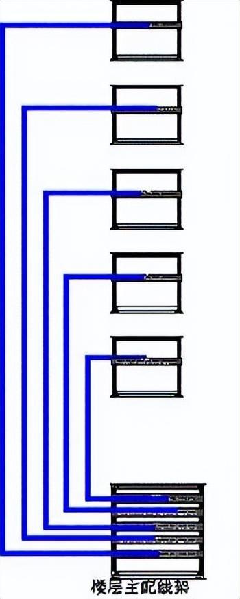 垂直干线子系统由连接主设备间至各楼层配线间之间的线缆构成。其功能主要是把各分层配线架与主配线架相连。用主干电缆提供楼层之间通信的通道,使整个布线系统组成一个有机的整体。垂直干线子系统拓扑结构采用分层星型结构,每个楼层配线间均需采用垂直主干线缆连接到大楼主设备间。垂直主干采用25对大对数线缆时,每条25对大对数线缆对于某个楼层而言是不可再分的单位。垂直主干线缆和水平系统线缆之间的连接需要通过楼层管理间的跳线来实现。