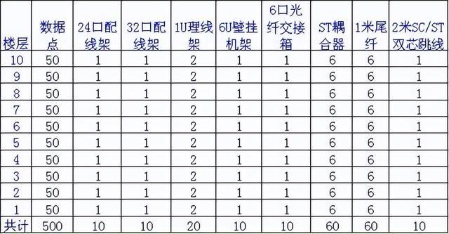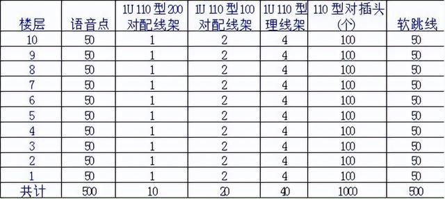 每层50个数据点、50个语音点;总计数据点500个,语音点500个;数据、语音水平系统均使用Futurecom UE/E六类非屏蔽或屏蔽双绞线;数据垂直主干系统采用Futurelink室内或多用途四芯或六芯多模光纤;语音垂直主干系统采用HAY五类25对大对数电缆。