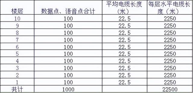 水平子系统是由建筑物各管理间至各工作区之间的电缆构成。为了满足高速率数据传输,数据、语音传输选用Futurecom UE/E六类非屏蔽或屏蔽双绞线。各楼层所需水平电缆长度统计如下表:
