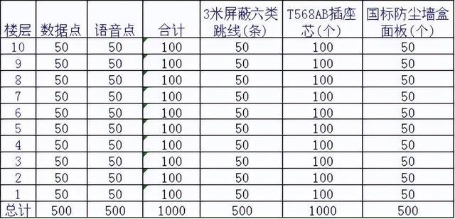 包括所有用户实际使用区域。共设数据点500个、语音点500个。为满足办公环境多媒体信息的高速传输,数据点、语音点全部采用Futurecom S250六类信息模块,使用国标双口防尘墙上型插座面板。数据点、语音点在每层分布如下表: