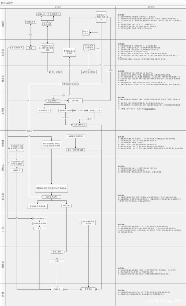 拓展部:负责新开店面性质(加盟/直营),并提报新开店基本信息(店铺名称/地址/联系人/联系电话等);确定新店召开,并负责《加盟客户合同签订》及《转让/租赁合同》;签订合同后,催缴保证金和首批货款;提前20天提报《新店开业需求计划》推送至相关部门;工程部:负责确定装修公司;安排协助实地测量店面尺寸、并确定面积报备财务/销售/商品,并5个工作日提交设计方案,提报《施工报价》至客户/公司;确定最终设计方案及图纸后,确定工程进场时间和施工期限,并把时间施工起止时间点推送各相关部门;按图纸监督安排进场施工及进度和完工交验等跟进工作;财务部:备份规档《客户加盟合同》和《转让/租赁合同》催缴客户品牌保证金、装修款及首批货款,在收到款项后的1个工作日内入账完毕,并通知销售和商品发货,并向客户提供结算清单;若是直营性质店铺,依据合同条款,则需支付转让方/房东(转让金/租赁金);销售部&企划部:接收新店开业通知后,1个工作日内确定店铺面积和预估销售业绩,推送至商品部;直营店铺开业,需提前5个工作日向财务部,申请刷卡机,并提供办理刷卡机需要的相关信息;确定《新店开业活动方案》及《推广物料需求方案》,需在3个工作日内完毕;安排督导对新店导购员进行技能和销售技巧进行培训,并在店铺装修完1个工作日会店支援店铺后期开业;与信息部沟通,对终端店员ERP/POS系统实操培训;安排监督企划部确定推广POP./海报设计及制作下发,原则要求店铺开业前2天内到位,以便店铺布场;商品部:接收销售部开业需求后,6个工作日内完成备货方案;确定最终备货方案后,并制作ERP系统单《新店配货单》,1个工作日内上报财务客户货款,并由财务核算首批货款;接收财务货款到位后,审核《新店配货单》通知仓库配货及出货;IT部/物流部/店铺:IT部在接收《新店开业通知》后,负责ERP系统基础资料建档和POS设置;IT部配置电脑硬件设备并按照POS及ERP系统;物流部执行商品指令,在接收商品指令后2个工作日内必须安排配货出货完毕;按要求发货,并确认跟进货品物流进度和预计到货时间至商品部;店铺负责货品到店后,实物/系统收货,并协助店铺开业布场及货品陈列摆放,要求在开业前2个工作日内完毕;关闭店流程: